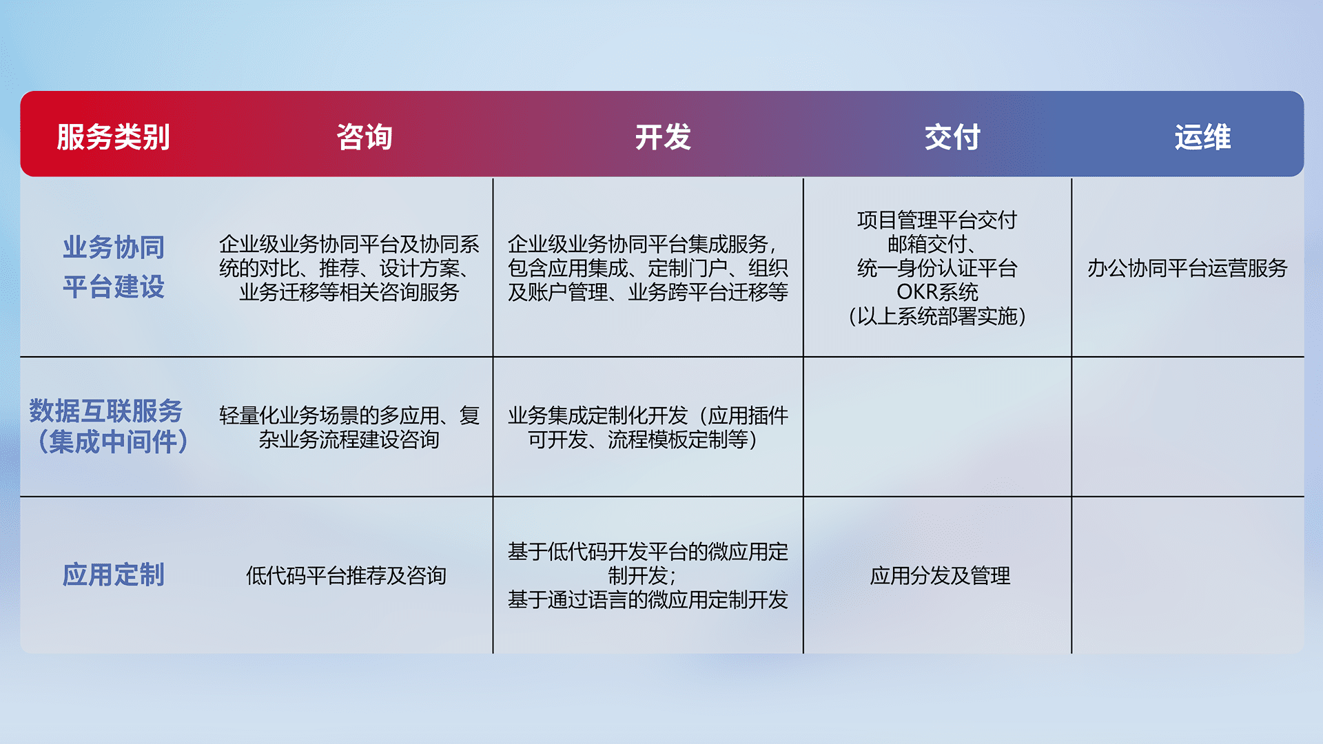 针对钉钉、、、、企微、、IDaas等平台级产品提供产品的规划、、方案、、交付、、定制化开发等服务,,,实现如统一协同办公、、、、智能客户服务、、、、混合会议管理、、智能数据查询、、、、等业务场景,,实现数字化转型。。