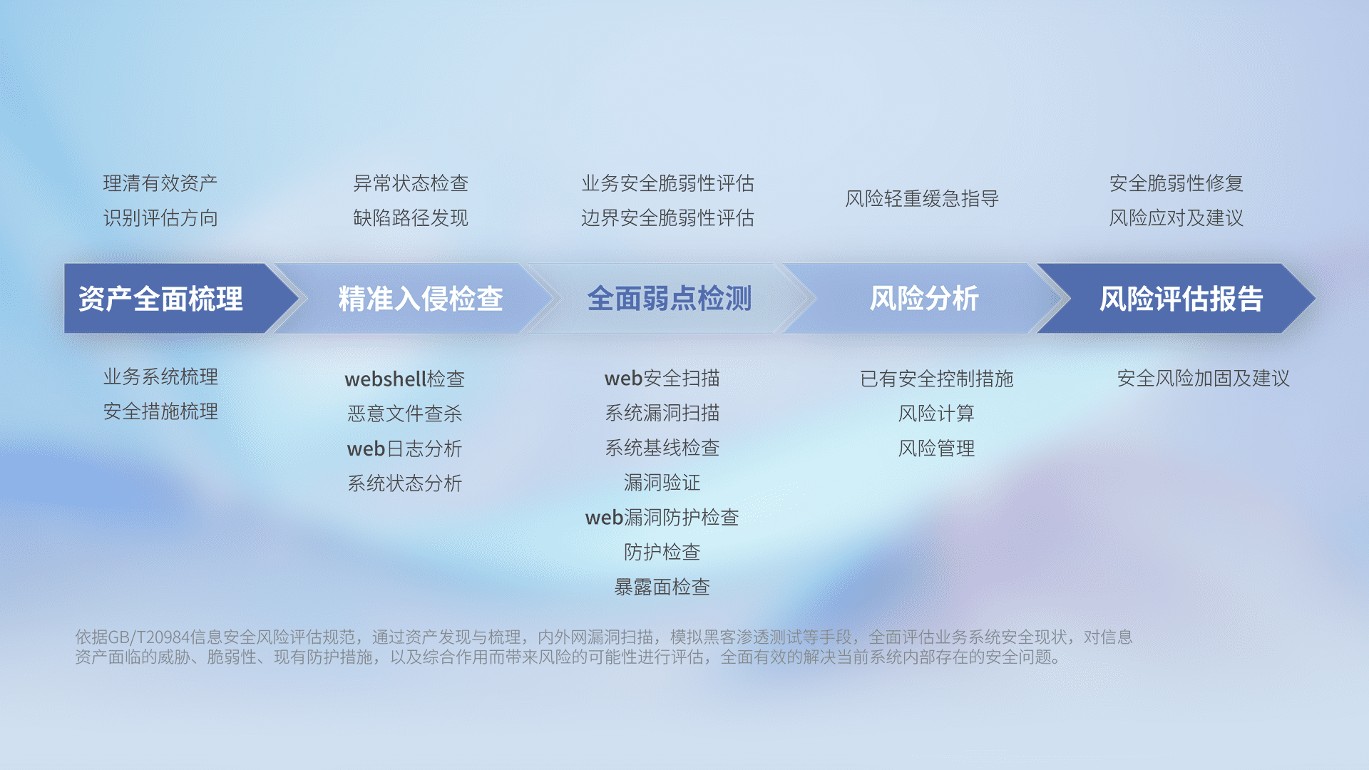 针对客户行业特性,,以专业的安全服务+多厂商联合解决方案提供专属的一站式安全管理服务,,,帮助客户全面感知网络空间威胁,,,,基于识别、、、、检测、、、分析、、防护、、、、监测、、响应的服务理论模型,,从方案咨询、、、、集成交付、、评估验证、、优化加固、、、运维运营,,,致力于为客户提供完整的闭环管理式安全服务。。。以实战经验为客户打造高抵御风险的安全体系,,帮助客户发现威胁、、、对抗威胁、、、、处置威胁,,,,不断积累安全对抗能力,,,持续保障数字化安全。。
