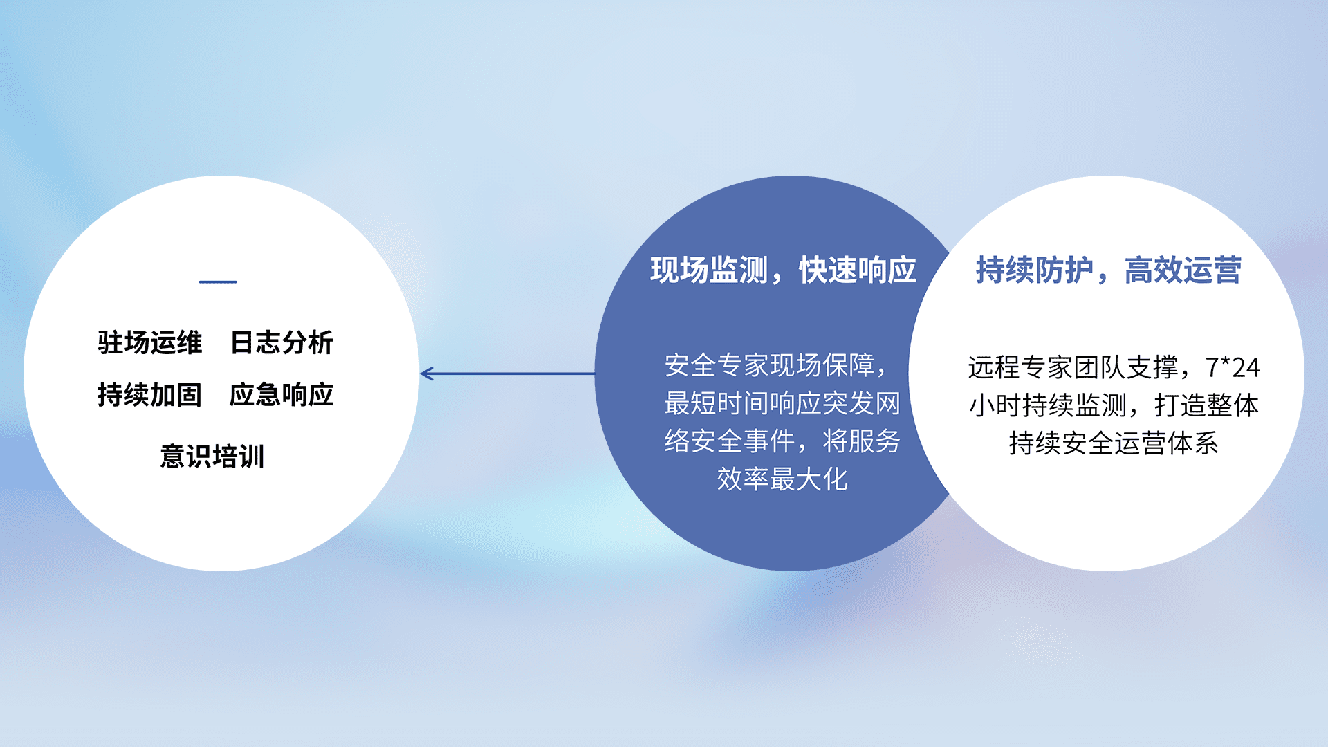 针对客户行业特性,,,,提供专属的一站式安全管理服务,,帮助客户全面感知网络空间威胁,,,通过安全专家的线上、、、、线下防护支持,,,,实现风险闭环,,,,将安全保障常态化,,,为客户打造常态化安全运维运营服务。。。